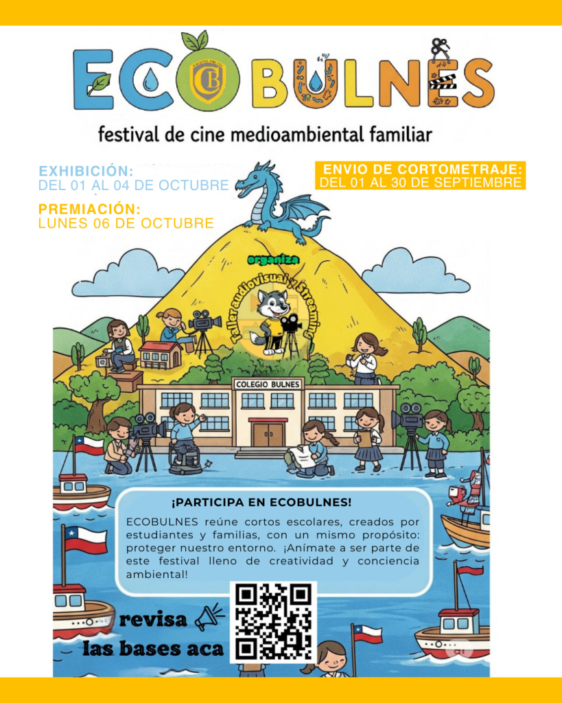 A manos del Taller Audiovisual y Streamming, el Colegio Bulnes llevará a cabo el Festival Escolar de Cine Ambiental “EcoBulnes”, una iniciativa dirigida a estudiantes de 1° a 8° básico que busca fomentar la conciencia ecológica y la creatividad a través de la producción de cortometrajes educativos.